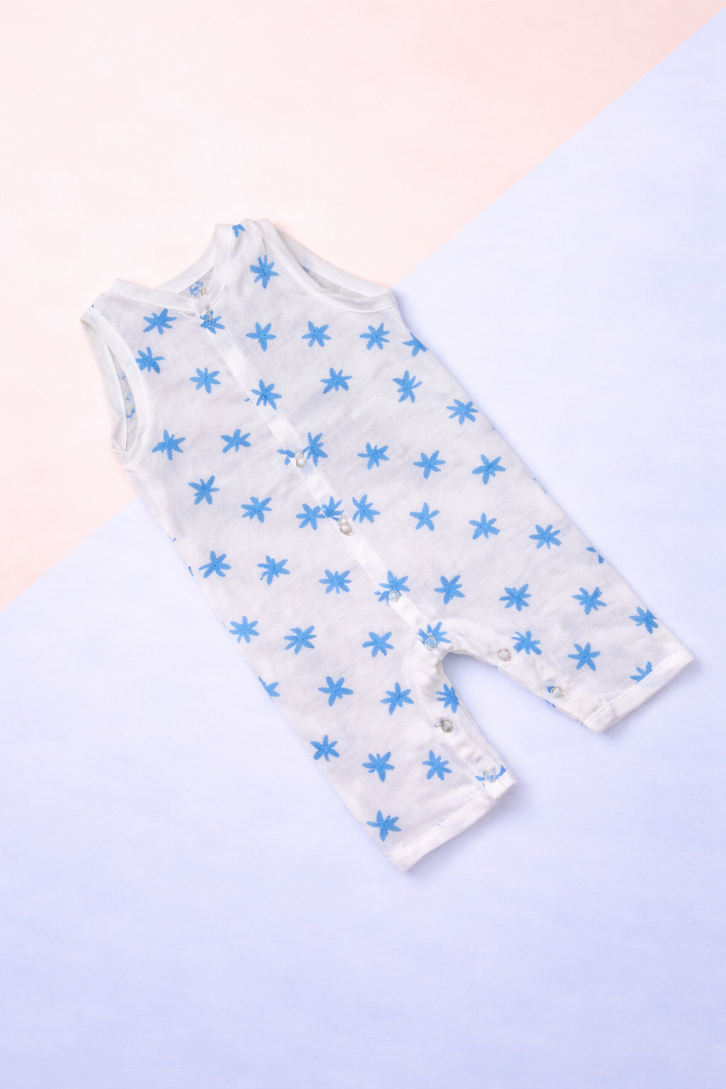 Blue Star Print Sleeveless Baby Romper – Soft & Breathable Muslin Cotton
