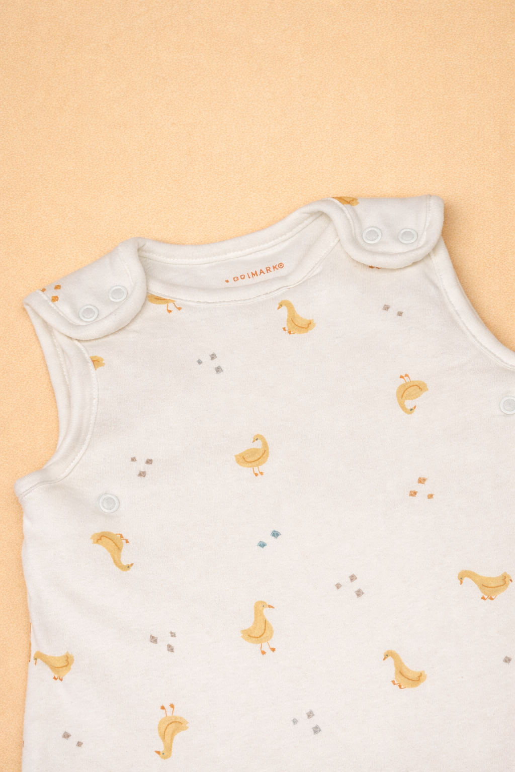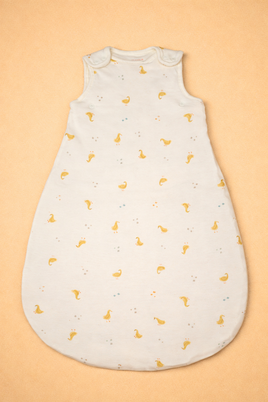 This sleeping bag features a soothing off-white base adorned with adorable yellow duck prints, creating a calm, minimal, and gender-neutral look. The sleeveless design allows free movement while maintaining warmth, and the snap-button shoulder openings ensure easy dressing and diaper changes.