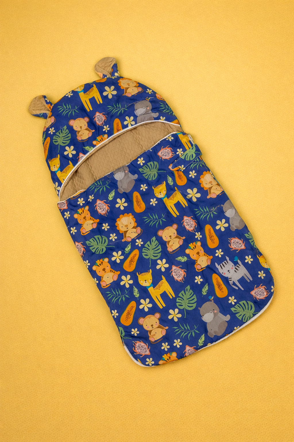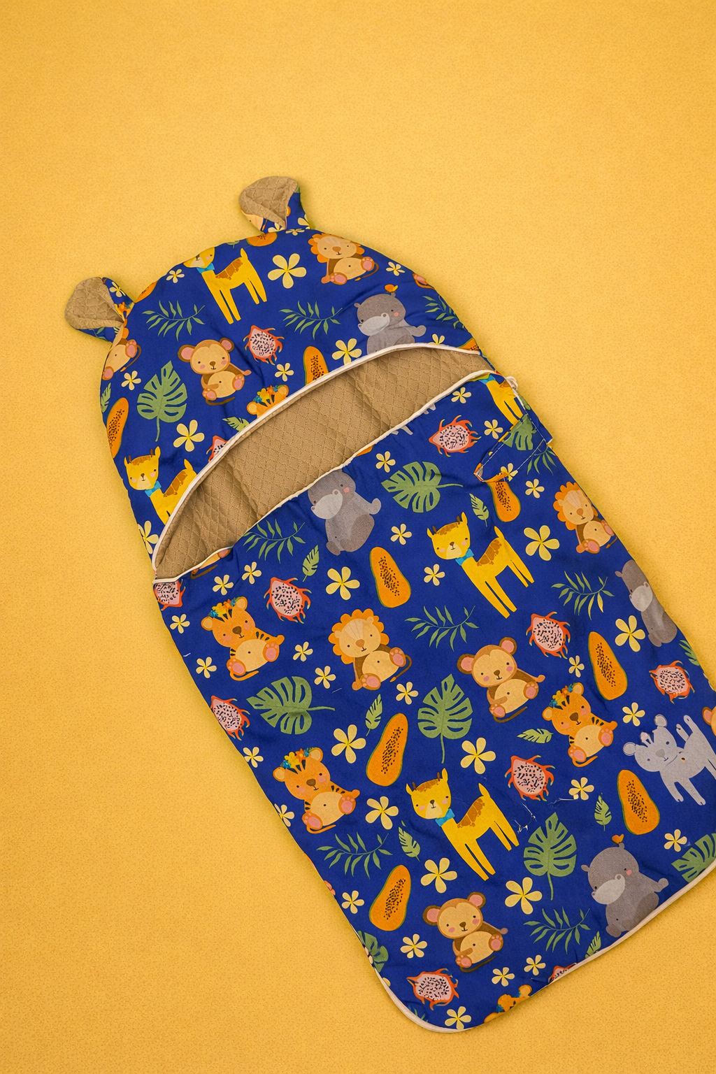 Create a cozy and secure sleep space for your little one with this cotton baby sleeping bed, designed for everyday comfort and convenience. Made from soft, breathable cotton fabric, this bed features a cheerful blue base with cute jungle animal prints, making it both fun and soothing for babies.
