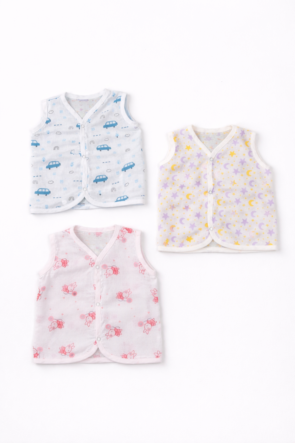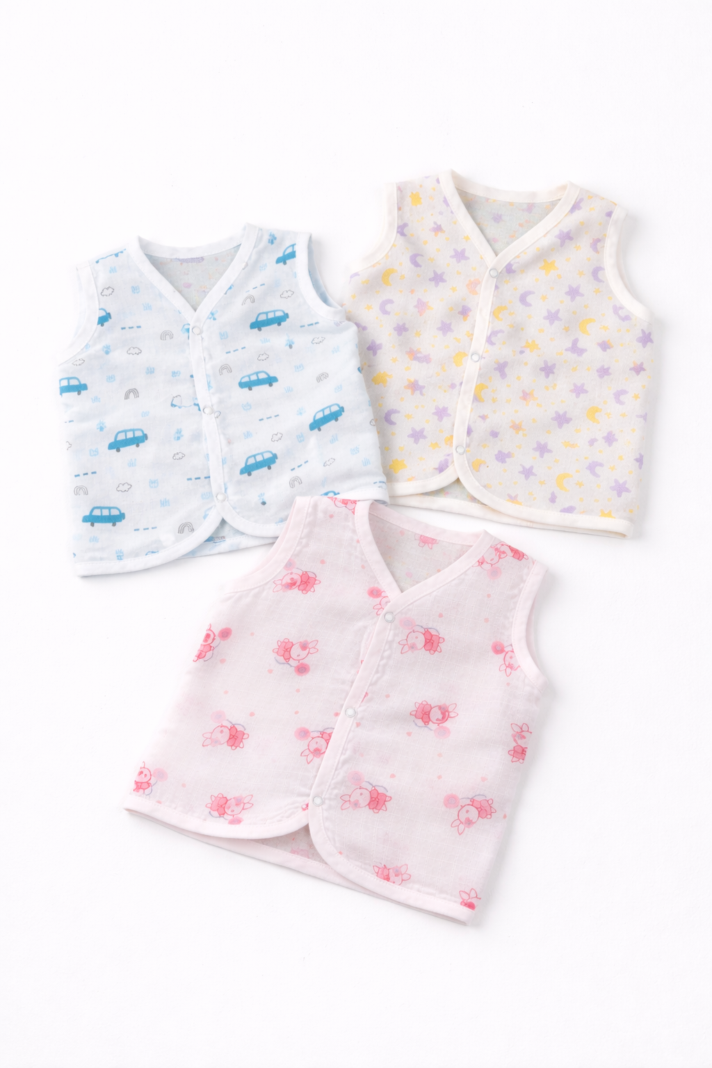 Baby sleeveless shirts made from soft cotton fabric, designed with a front-open snap button closure for easy wear. Featuring three printed design options—car print, moon & star print, and teddy bear print. Lightweight and breathable, these shirts are suitable for newborns and toddlers and intended for bulk production, private labeling, and export supply.