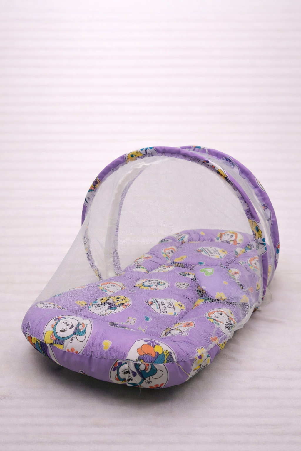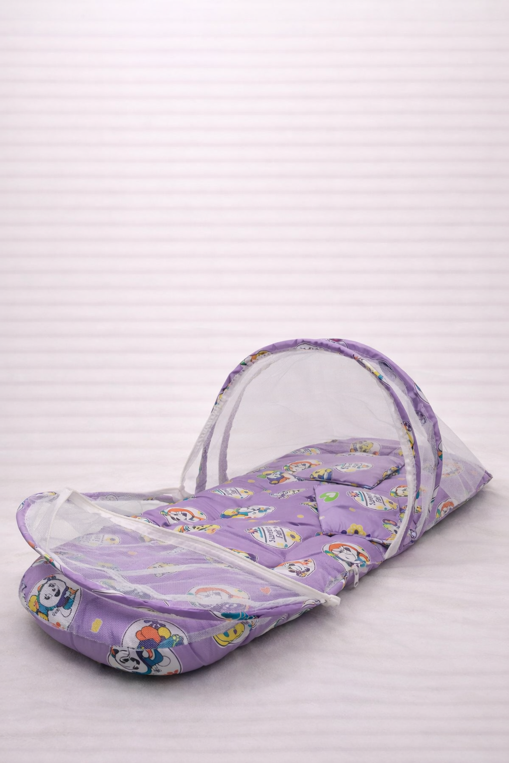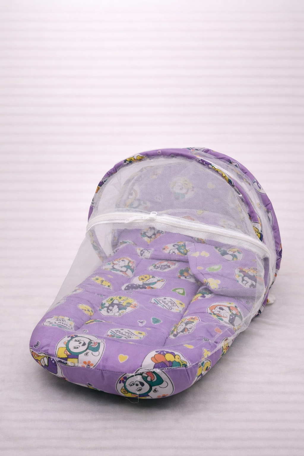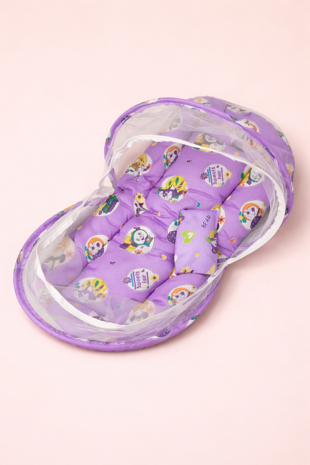Create a safe and comfortable sleeping space for your baby with this purple baby mosquito net bed, designed with a soft cushioned mattress and a breathable zip-closure mesh for complete protection from mosquitoes and insects.