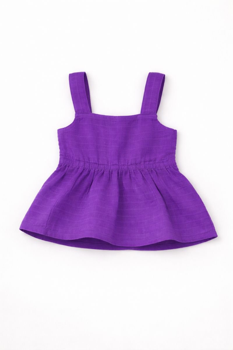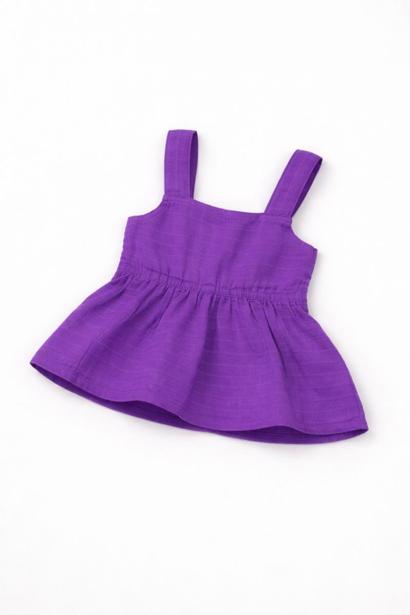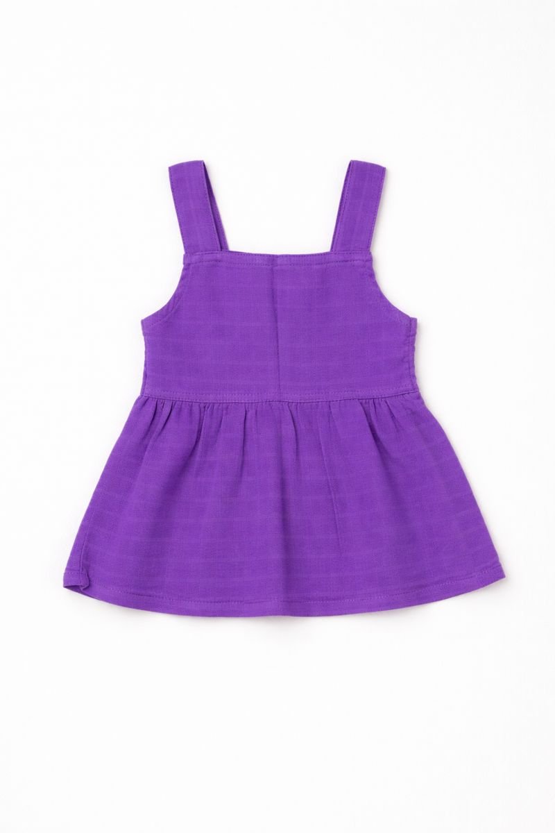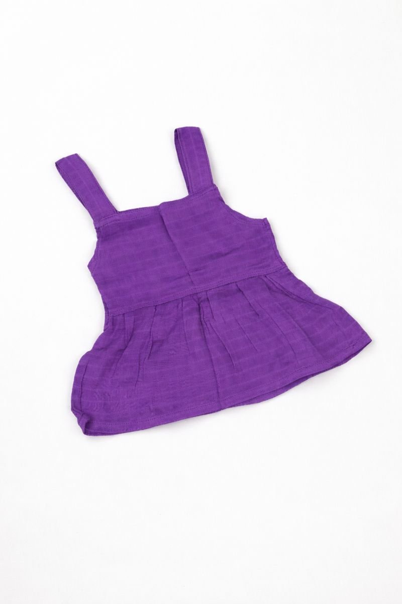 This purple sleeveless baby dress is designed with a square neckline and broad shoulder straps for a secure, comfortable fit. The gathered waist creates a soft flared skirt, allowing easy movement for babies while keeping the silhouette neat and structured. Crafted from lightweight, breathable cotton fabric, it is gentle on sensitive skin and suitable for warm-weather wear.