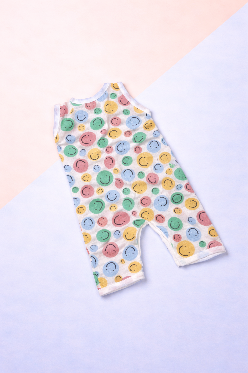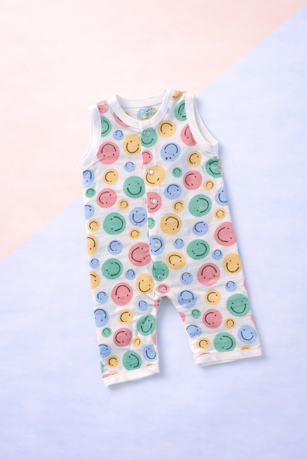 The sleeveless cut allows free movement, while the front snap button closure makes dressing and diaper changes quick and easy. Featuring cheerful pastel smiley prints, this romper adds a fun and playful touch to your baby’s daily essentials.