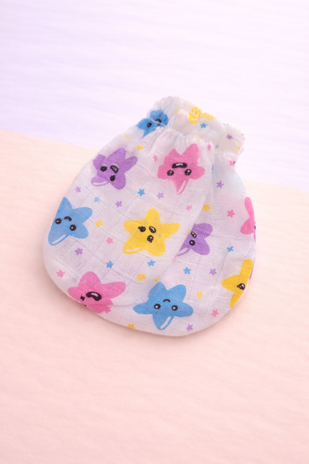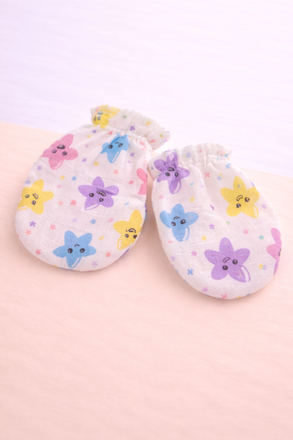 The cheerful smiley star print adds a playful and adorable look, making these mittens perfect for daily use or newborn gifting. A simple yet essential accessory for newborn comfort and care.