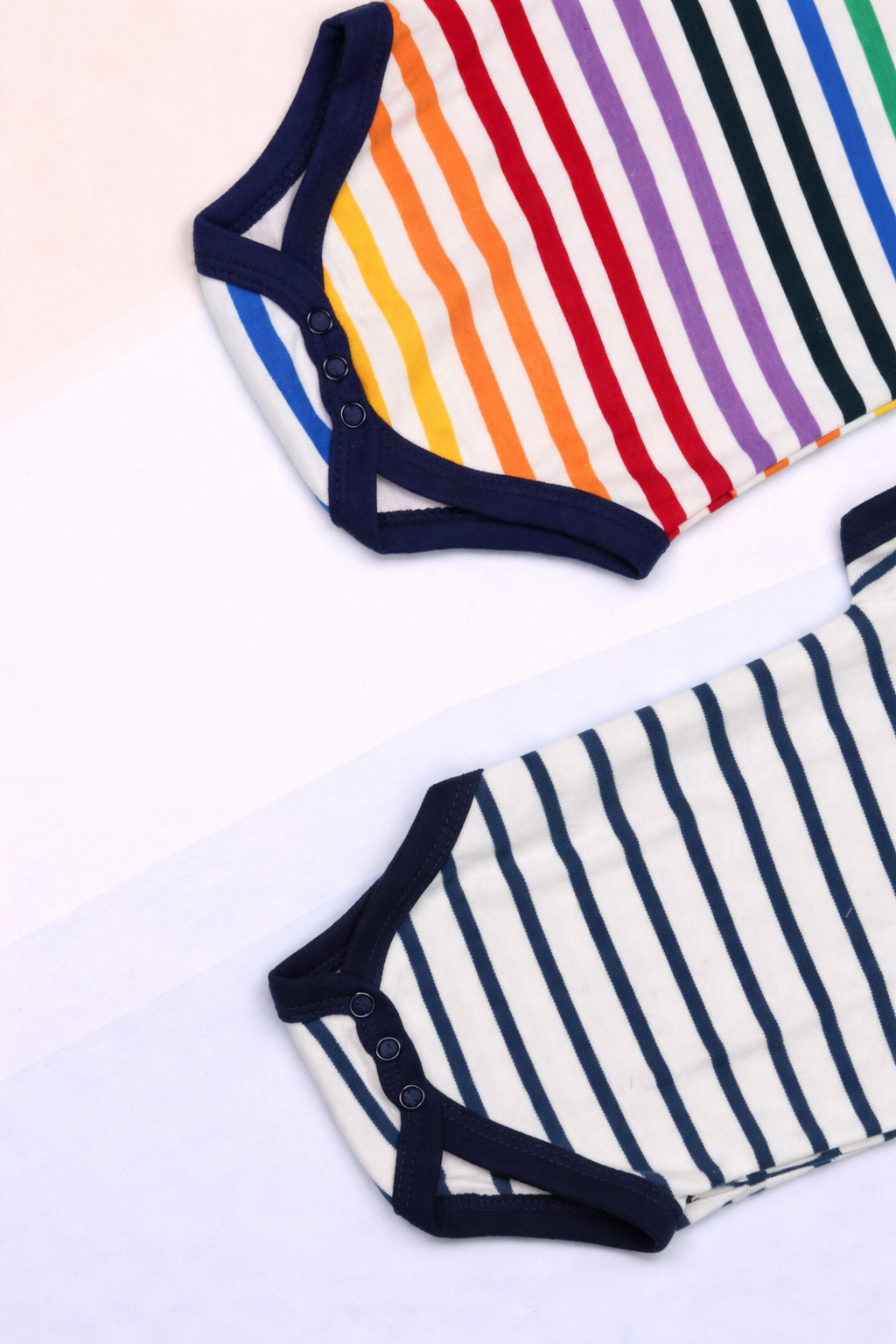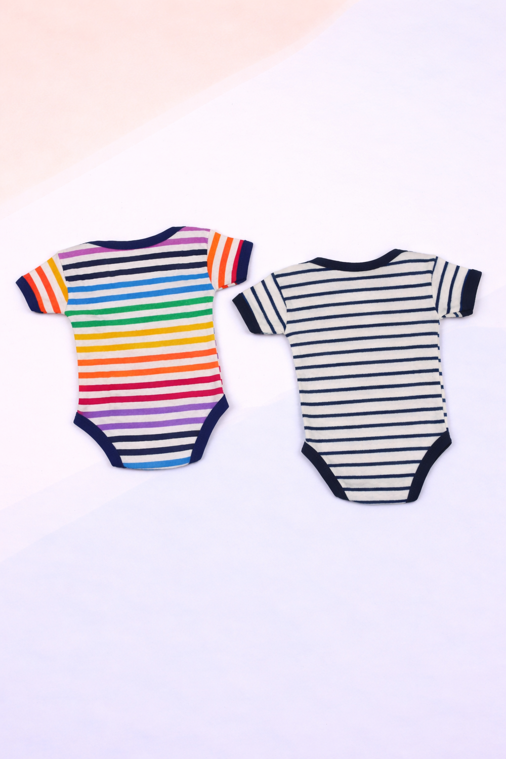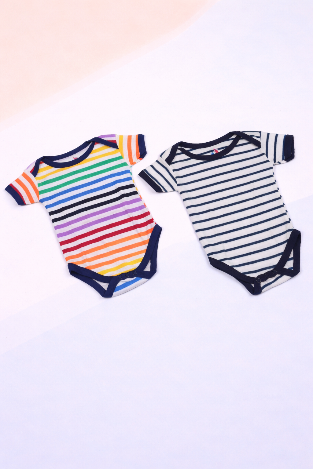 This baby bodysuit set features two stylish striped designs crafted from soft, breathable cotton for all-day comfort. One bodysuit comes in vibrant multicolor stripes, while the other offers a classic navy-and-white striped pattern—perfect for both playful and timeless babywear collections.